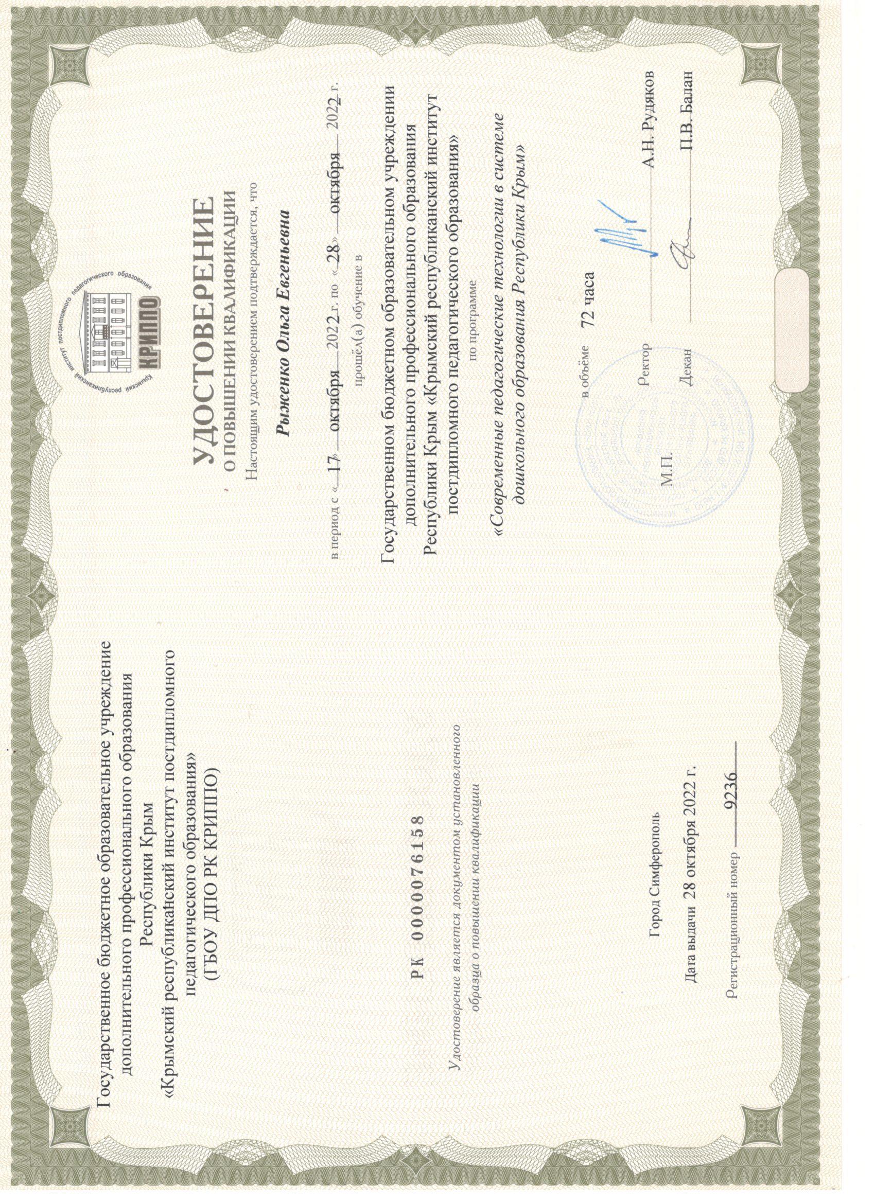 2022 год: ГБОУ ДПО РК "КРИППО" - "Современные педагогические технологии в системе дошкольного образования Республики Крым"